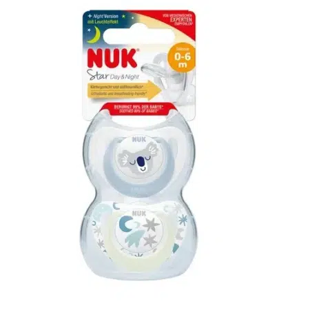 NUK Sucette en Silicone Starlight Age 0 à 6 mois 2 pièces (Bleu/Blanc)