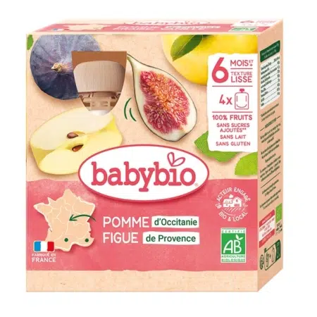 Babybio Fruits Bébé Pomme d’Occitanie Figue de Provence Pack de 4 gourdes de 90g