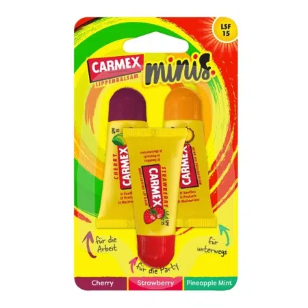 Carmex Soin des Lèvres Spf15 Trio Minis Saveurs : Fraise Ananas Menthe-Cerise 3x5g