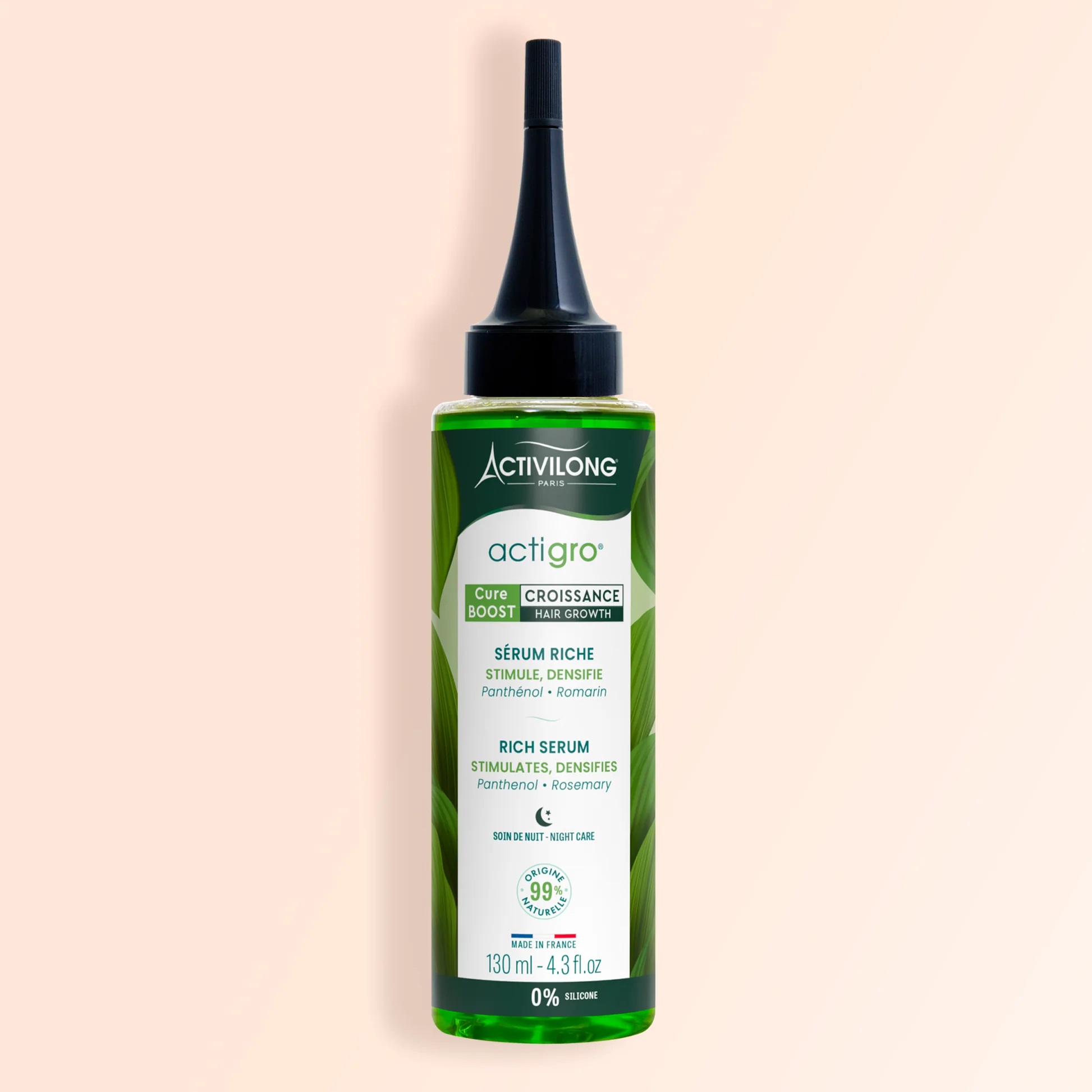 Procédez à une cure de 2 mois : appliquez 1 soir sur 2 le sérum sur le cuir chevelu, raie par raie, en le massant. Le Sérum Riche Actigro réduit les pellicules. Ne pas rincer.