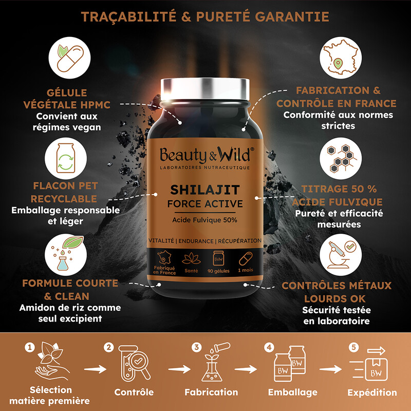 Notre Shilajit en gélules est fabriqué en France, dans le sud-ouest, au sein d’un laboratoire expert en phytothérapie depuis plus de 20 ans. Chaque pilulier contient 90 gélules, soit une cure de 30 à 45 jours. Un gage de traçabilité, sécurité et qualité pharmaceutique.