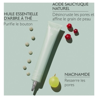 L’acide salicylique naturel, la niacinamide, et l’huile essentielle d’arbre à thé permettent d’assainir et assécher les boutons. Sa couleur vert clair atténue les rougeurs.