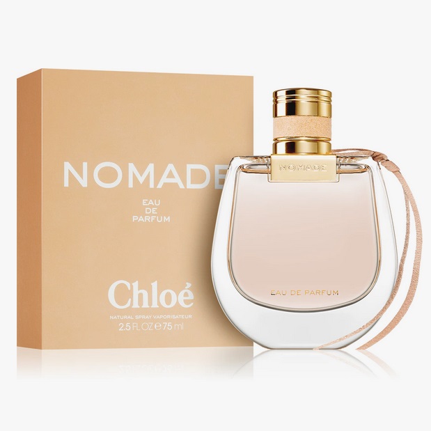 Le flacon Nomade évoque l’évasion, avec des transparences laissant filtrer une lumière beige rosée. Des courbes rondes féminines et un cabochon aux reflets éclatant orné d’un délicat lien de suédine rose.