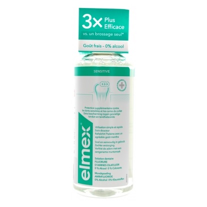 Elmex Sensitive Solution Dentaire 400 ml est une solution dentaire au fluorure d’amines qui assure une protection supplémentaire contre les dents sensibles et les caries du collet.