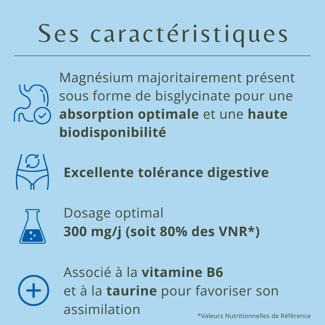 Association de magnésium sous forme de bisglycinate (85%) et d’oxyde (15%) pour une meilleure biodisponibilité