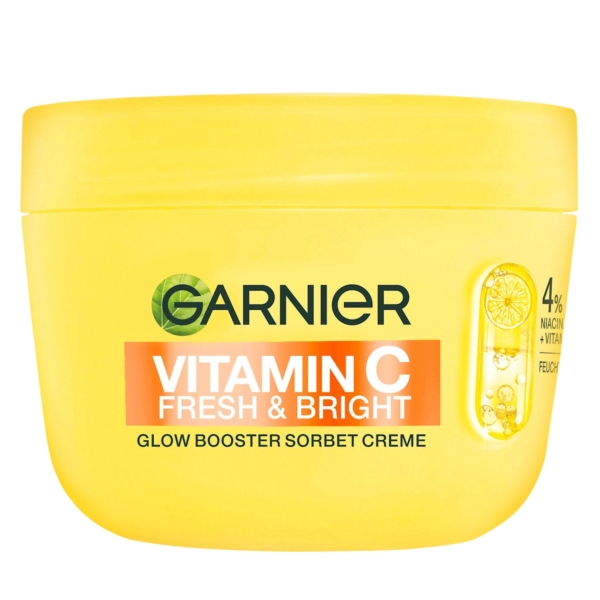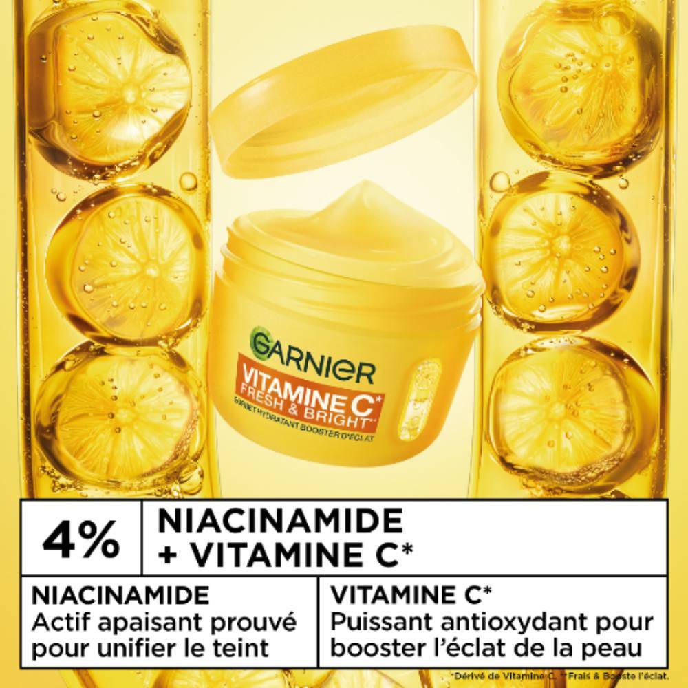 Pour un teint plus éclatant et uniforme, essayez la Crème Sorbet Éclat Booster de Garnier à la Vitamine C. Sa formule nourrissante à la vitamine C et à 4 % de niacinamide atténue visiblement les taches brunes et hydrate durablement. Grâce à sa texture sorbet légère, la crème est agréablement imperceptible sur la peau et pénètre rapidement sans laisser de film gras ou collant.