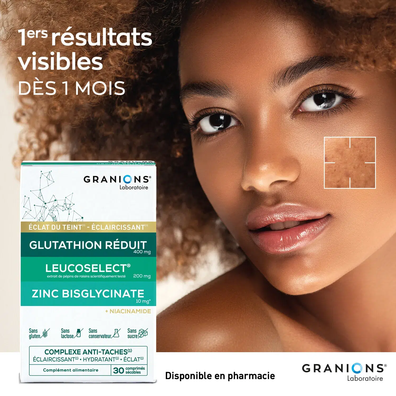 Avec l’âge, l’exposition au soleil, les changements hormonaux et d’autres agressions extérieures, des taches pigmentaires peuvent apparaître sur la peau. Pour répondre à ce besoin, Granions® a développé une formule innovante et complète pour réduire l’apparence des taches brunes et améliorer l’éclat du teint.
