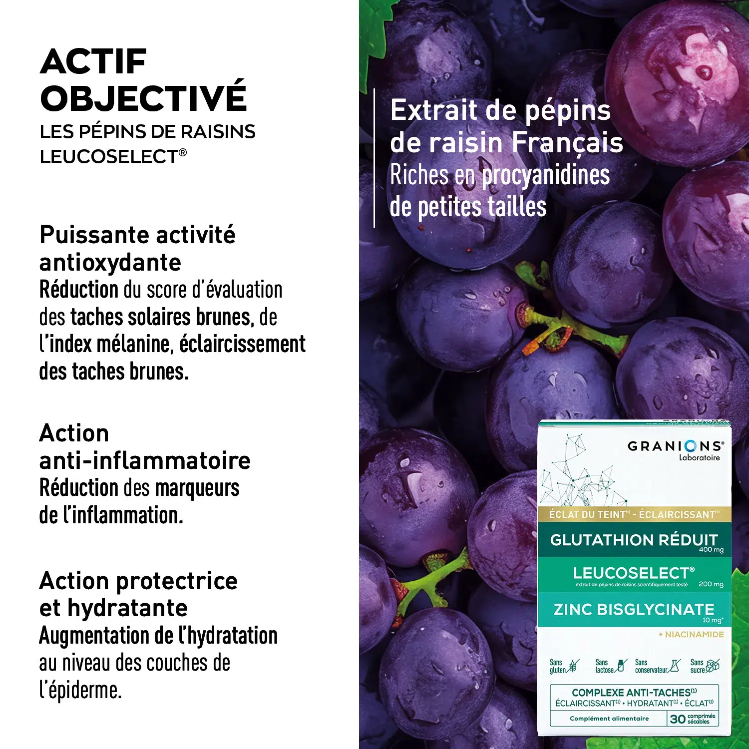 Extrait de pépins de raisins Leucoselect® (200 mg) : Riche en OPC (Oligomères Proanthocyanidoliques), il contribue à réduire le stress oxydatif et favorise un teint plus éclatant.