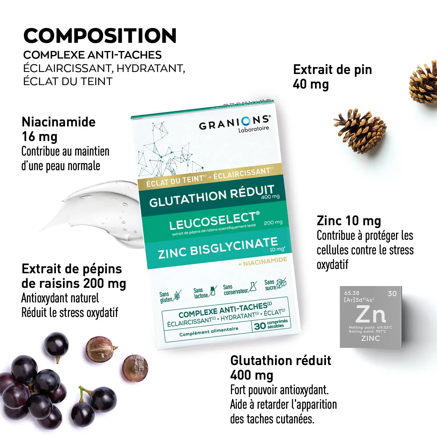 L-glutathion réduit, extrait de pépins de raisins (Vitis vinifera L.), agents de charge : phosphate tricalcique – cellulose microcristalline, vitamine C, extrait de pin (Pinus pinaster), bisglycinate de zinc, anti-agglomérant : sels de magnésium d’acides gras, vitamine B3, L-sélénomethionine (phosphate dicalcique), vitamine B2.