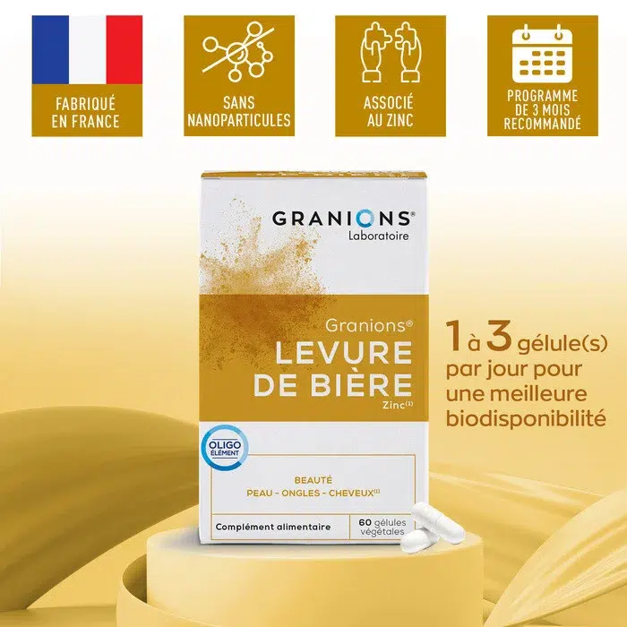Le produit Granions Levure de Bière repose sur une formule naturelle riche en nutriments essentiels. La levure de bière, appelée Saccharomyces cerevisiae, est une source exceptionnelle de vitamines du groupe B, d’acides aminés, et de protéines. Ces éléments sont essentiels pour soutenir la santé de vos cheveux, de votre peau et de vos ongles.