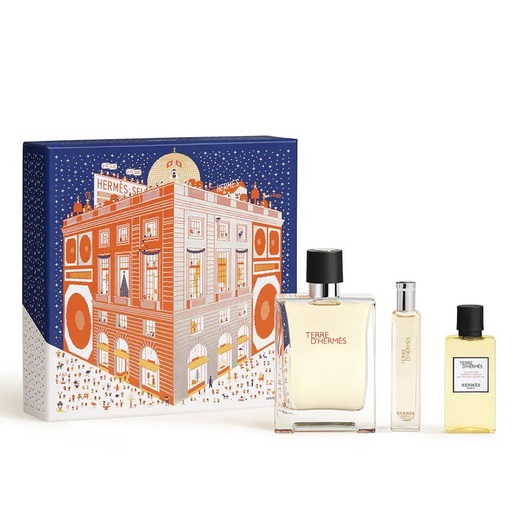 Le coffret est composé d’une Eau de Toilette Terre d’Hermès de 100 ml, d’une Eau de Toilette Terre d’Hermès nomade de 15 ml et d’un gel douche corps et cheveux de 40 ml.