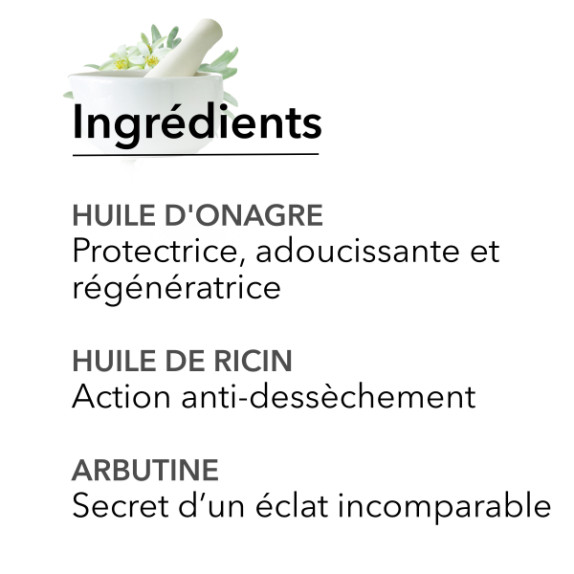 Huile d’onagre : Protectrice, adoucissante et régénératrice, elle nourrit et revitalise la peau.