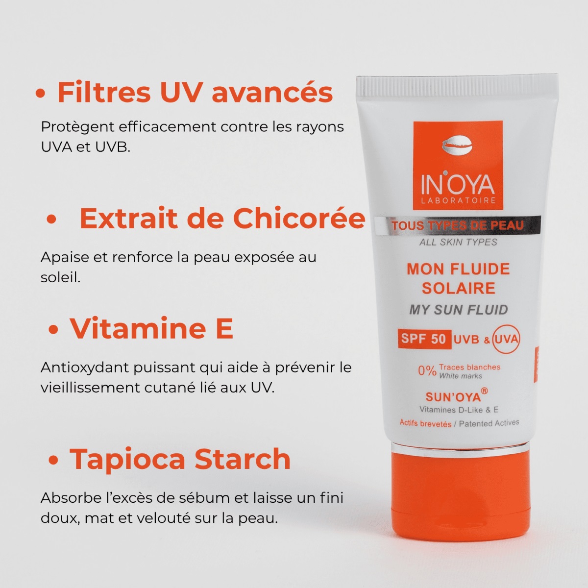 Mon Fluide Solaire SPF 50 « SUN’OYA » garantit une haute protection solaire et filtre les UVB & les UVA pour un résultat remarquable : une peau noire, mate et métissée, protégée sans traces blanches.