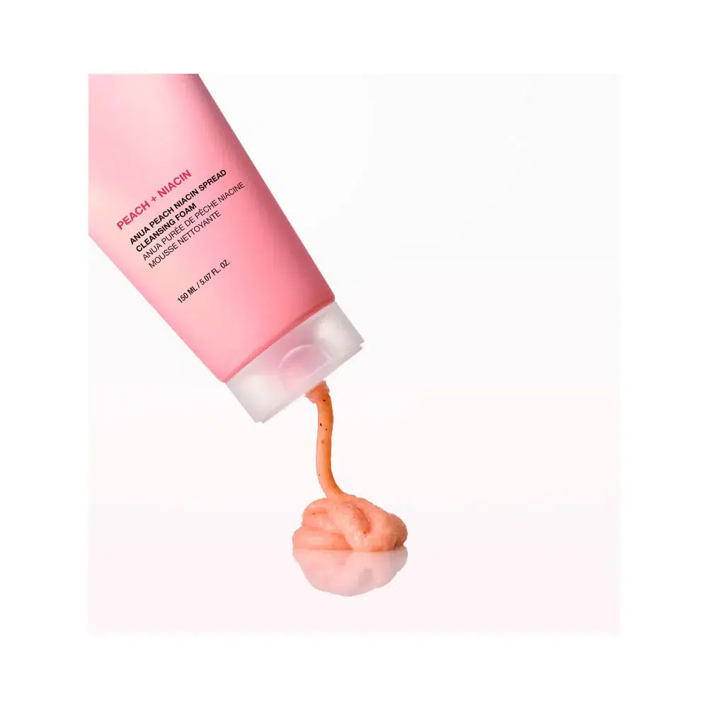 La Peach Niacin Spread Cleansing Foam d’Anua est une mousse nettoyante douce infusée à l’extrait de pêche et à la niacinamide.