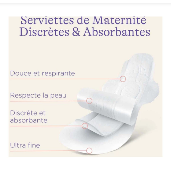 Précautions d’emploi : Il est important de bien suivre les recommandations du produit et de changer régulièrement la serviette maternité pour réduire le risque d’infection bactérienne, en effet, le syndrome du choc toxique est rare, mais les blessures post accouchement peuvent être davantage susceptibles d’être infectées par les bactéries responsables du syndrome du choc toxique.