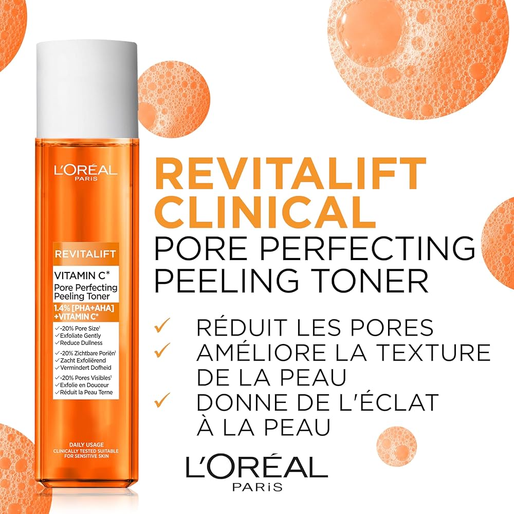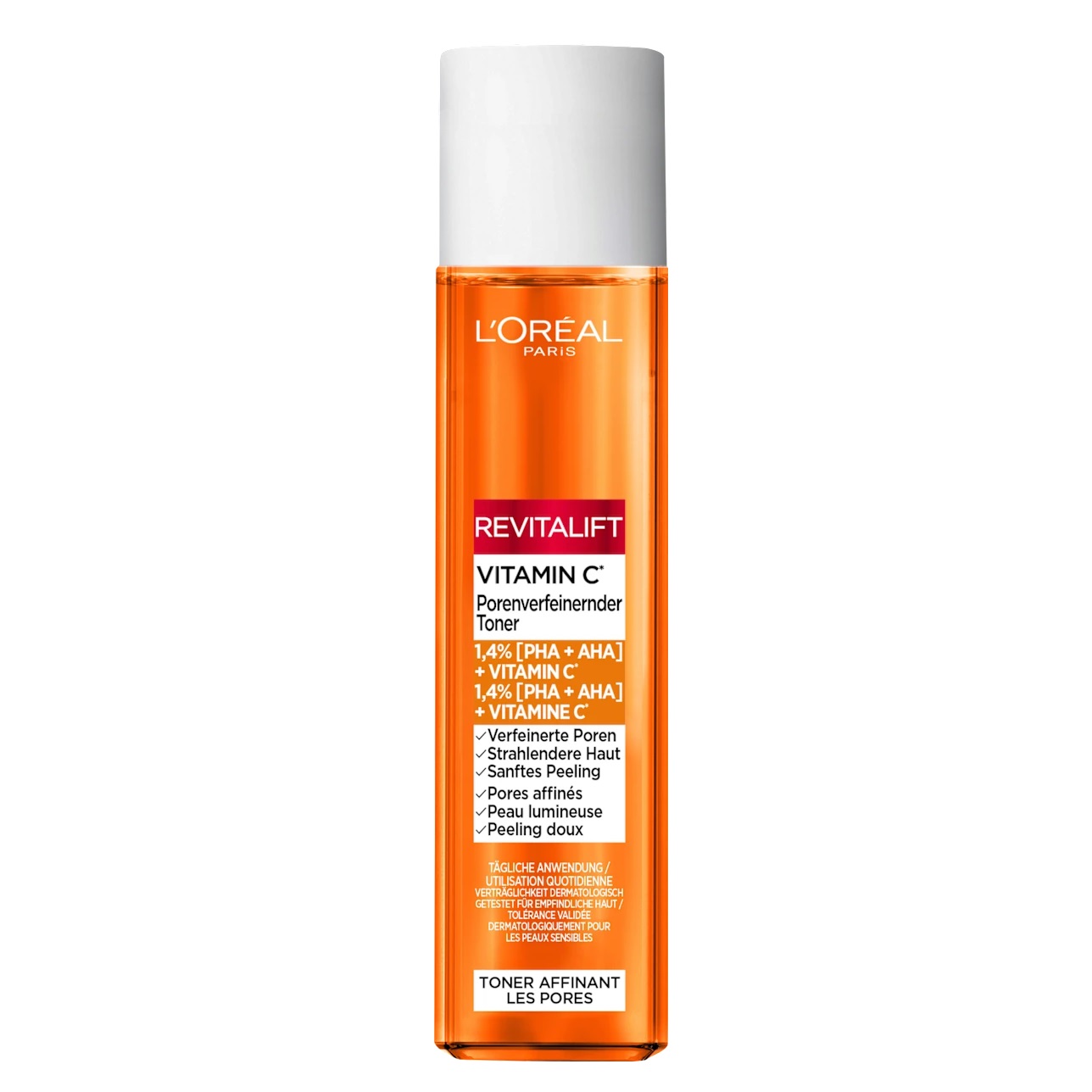 Avec le tonique resserrant les pores Revitalift Vitamine C de L’Oréal Paris, les pores sont resserrés et le teint est illuminé en un clin d’œil. Le duo d’ingrédients actifs contenant 1,4 % de PHA et d’AHA permet d’exfolier la peau en douceur pour éliminer les cellules mortes, tandis que la vitamine C nourrissante illumine la peau et favorise l’amélioration de son aspect. Il est démontré que les pores dilatés sont réduits jusqu’à 20 % et que le teint est plus lisse.