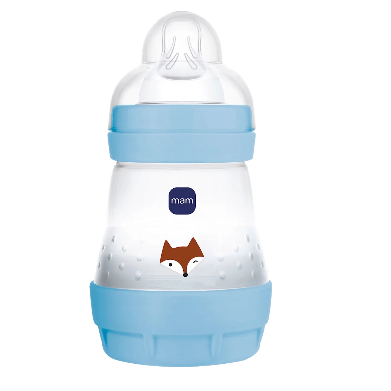 Le biberon Easy Start Anti-Colic bleu de mam, d’une contenance de 160 ml, a été conçu pour une tétée particulièrement agréable.