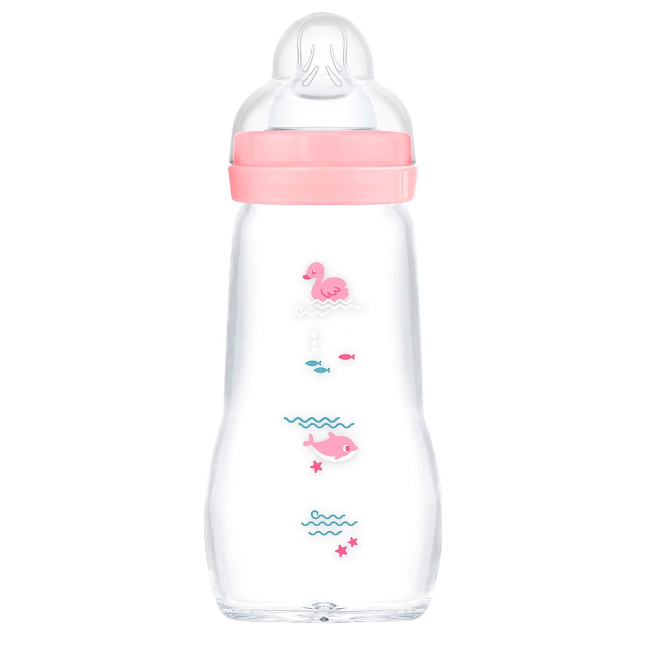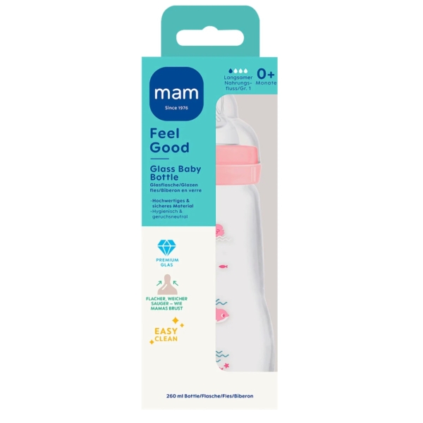 Le biberon en verre rose mam Feel Good, adapté dès la naissance et d’une contenance de 260 ml, est idéal pour les parents qui privilégient le verre traditionnel. Particulièrement résistant à la chaleur et aux chocs thermiques, il est également durable et hygiénique.