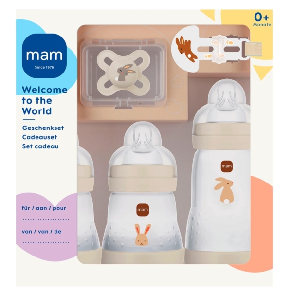 Le coffret « Bienvenue au monde » beige de mam est le cadeau idéal dès la naissance et constitue un précieux kit de démarrage. Grâce à sa valve de base innovante, le risque de coliques est réduit, car bébé avale moins d’air en buvant. La tétine en silicone SkinSoft extra-douce offre une sensation familière à bébé, facilitant ainsi la transition entre l’allaitement maternel et le biberon.