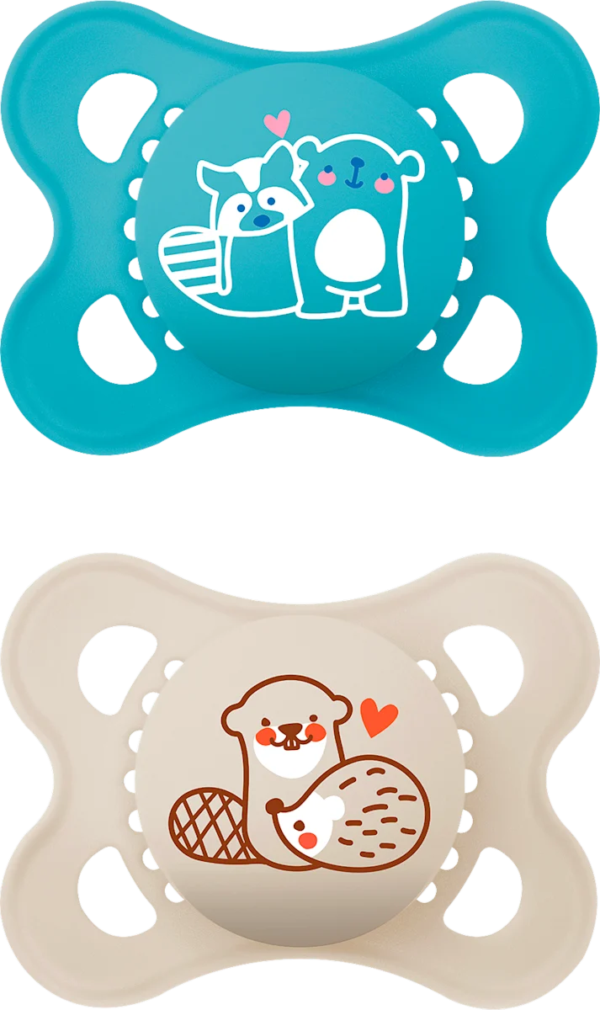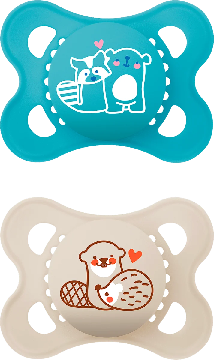 Le lot de deux sucettes en silicone MAM Original comprend une sucette bleue et une beige, toutes deux ornées d’un adorable motif animal. Grâce à leur silicone SkinSoft ultra-doux, ces sucettes compatibles avec l’allaitement offrent une sensation incomparablement douce et familière dans la bouche de bébé.