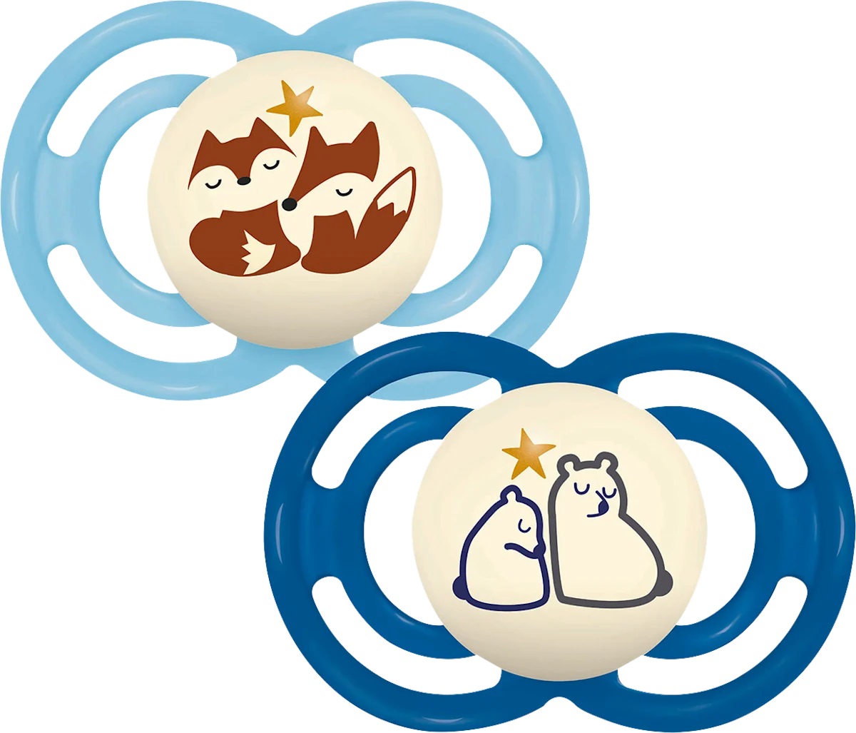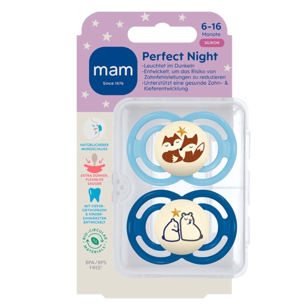 La sucette en silicone Perfect Night bleue (motif renard/ours) de mam, pour les bébés de 6 à 16 mois, a été spécialement conçue pour réduire les risques de malocclusion dentaire. Sa tétine en silicone SkinSoft offre une sensation de douceur incomparable et familière.