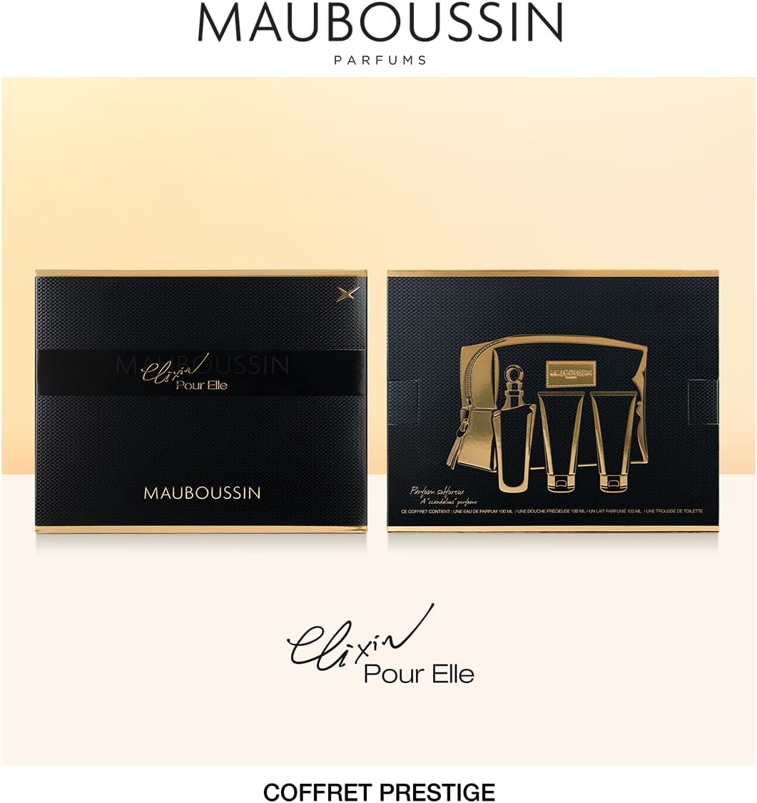 UN COFFRET SENSORIEL : Une eau de parfum Elixir Pour Elle 100ml, une douche précieuse parfumée pour le corps Elixir Pour Elle 100ml, un lait parfumé pour le corps Elixir Pour Elle 100ml et une trousse de toilette noire et or.
