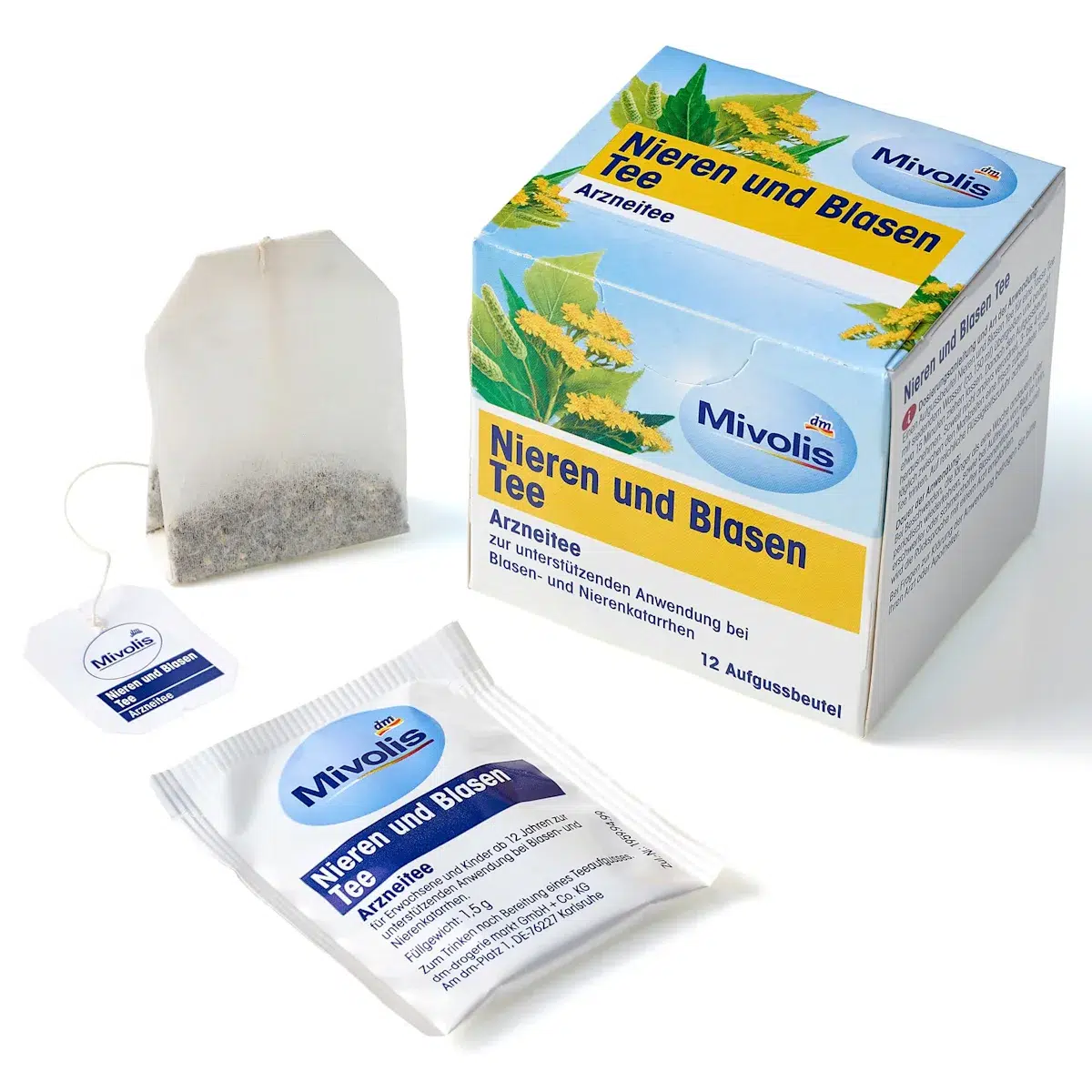 100 g de tisane pour les reins et la vessie contiennent : Ingrédients actifs : Feuilles de bouleau 25 g, feuilles d’Orthosiphon 25 g, racine de Restharrow 24 g, herbe de verge d’or géante 20 g. Autres ingrédients : feuilles d’ortie, feuilles de menthe poivrée, racine de réglisse, fleurs de bleuet.