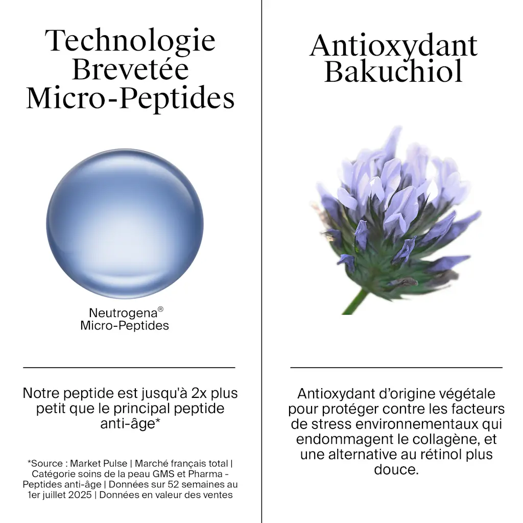 La crème hydratante Neutrogena Collagen Bank est conçue pour préserver le collagène naturel de la peau. Sa formule associe le bakuchiol, une alternative douce au rétinol, à une technologie brevetée de micro-peptides, qui assure une absorption optimale des actifs.