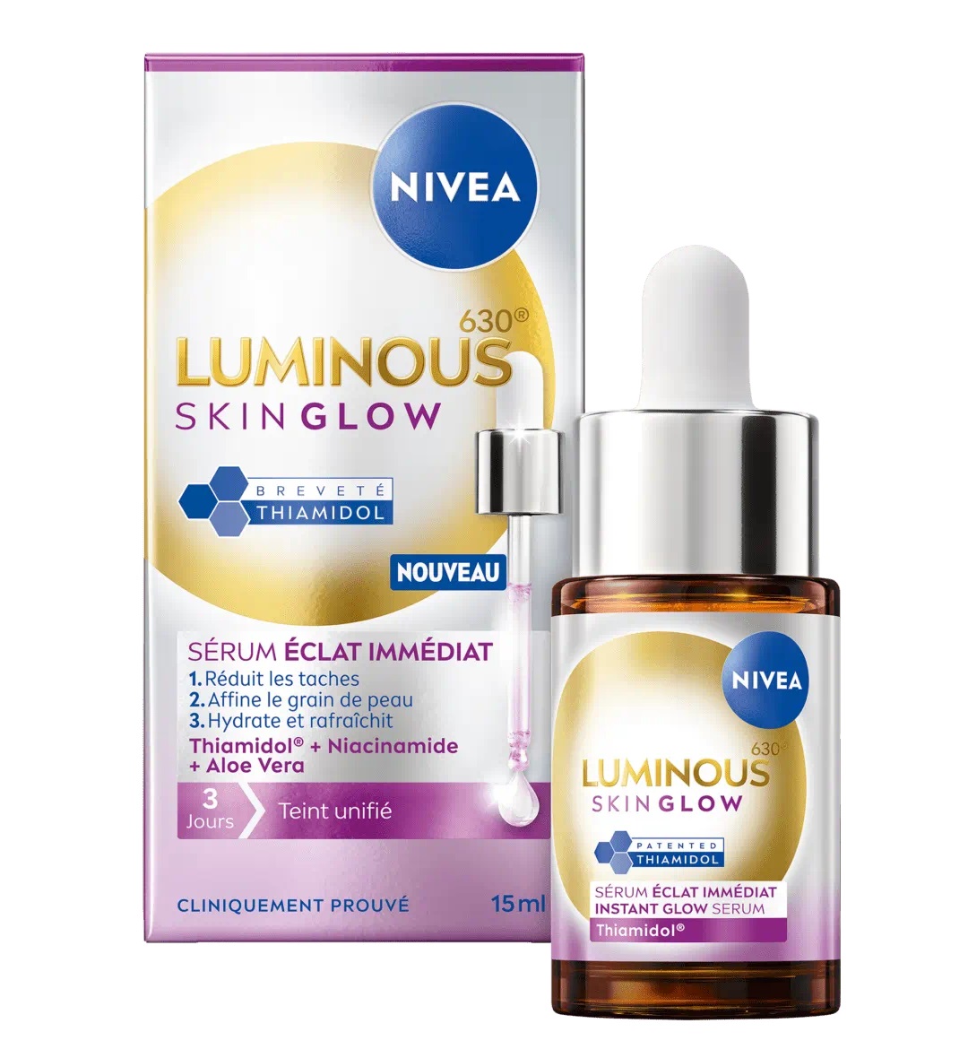 le Sérum Éclat Immédiat LUMINOUS SKIN GLOW sublime toutes les formes d’éclat. Unifie le teint dès 3 jours (auto-évaluation, 44 volontaires) et réduit les taches en 14 jours (évaluation clinique).