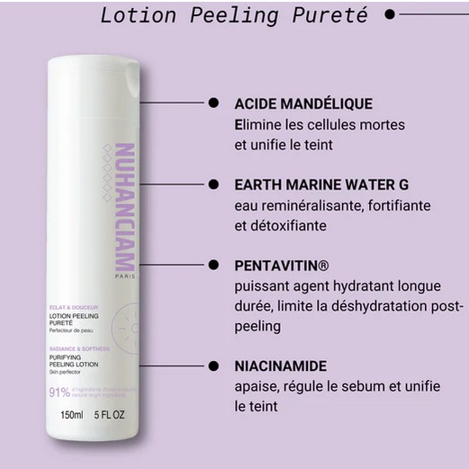La Lotion Peeling Pureté, pour le visage et le cou, révèle instantanément l’éclat naturel de la peau grâce à son action exfoliante douce mais efficace. Enrichie en acide mandélique, elle élimine délicatement les cellules mortes, désobstrue les pores et affine le grain de peau pour un effet peau neuve visible dès la première application.