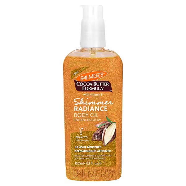 L’huile pour le corps Shimmer Radiance de Palmer, est fabriquée avec du beurre de cacao hydratant intensivement et un baiser de scintillement pour une alimentation instantanée et une peau éclairée magnifique.