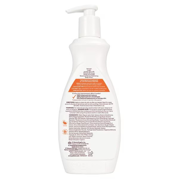 La formule de beurre de cacao de Palmer Smooth Radiant Exfoliating Body Lotion (400ml) a été formulée avec un triple mélange d’hydratants activateurs d’éclat pour lisser la peau rugueuse et cahoteuse et offre jusqu’à 48 heures d’hydratation.
